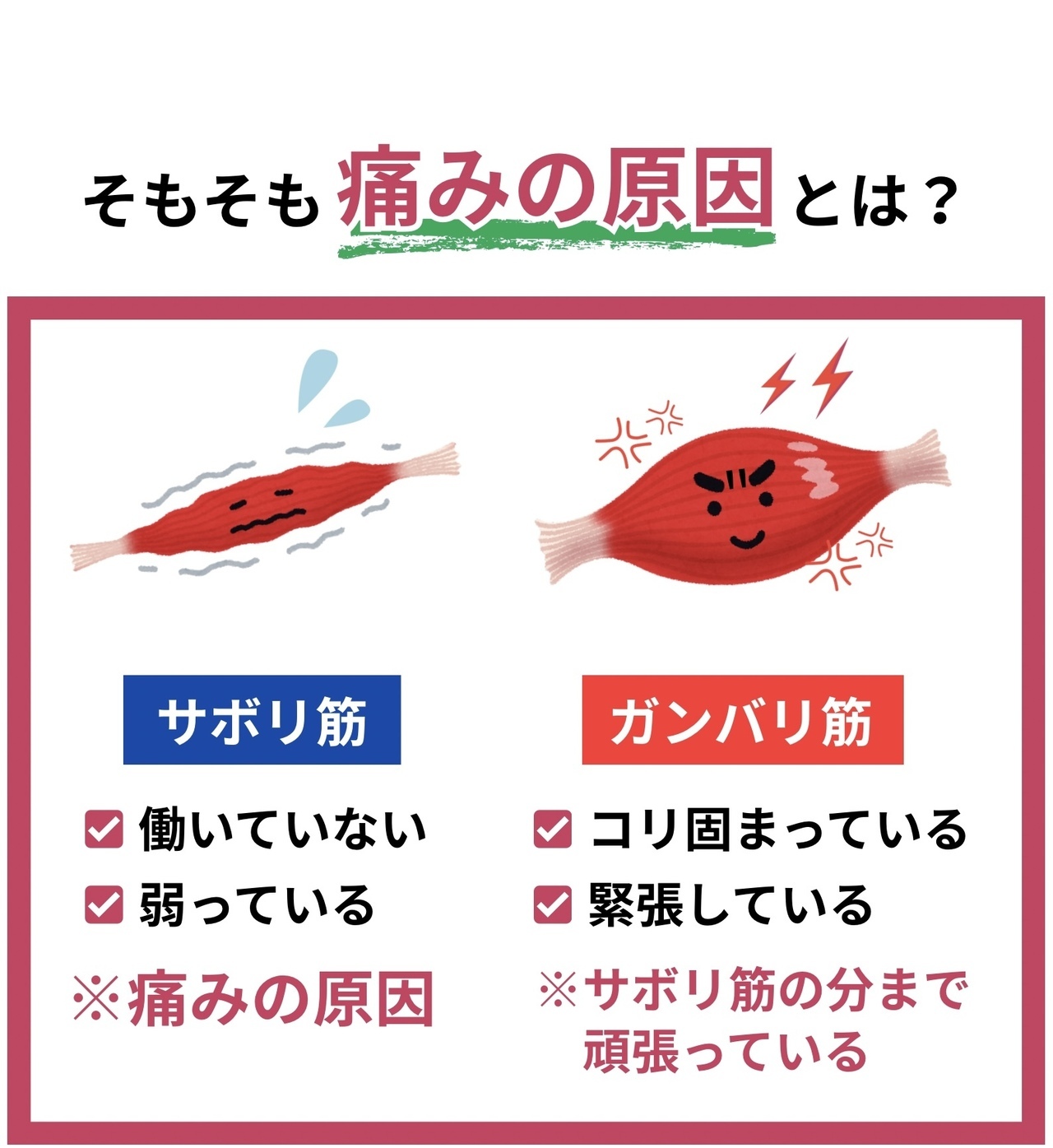 筋肉のアンバランスにより関節がスムーズに動がず、関節に負担をかけ続けた結果痛みが発生しているのです。